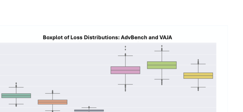 Loss Distributions Comparison under Attacks. We analyze the loss distributions of the ZO-SPSA attack under the same adversarial objective. Figure 2 shows these distributions as box plots, which reveal loss-stabilization behavior across different victim models and two datasets (AdvBench and VAJA). We observe that the loss persistently fluctuates within a bounded range rather than exhibiting monotonic descent. Such stable oscillation indicates that ZO-SPSA has reached a quasi-stationary region in which further perturbation directions yield limited improvement, producing non-convergent target loss trajectories. This practical behavior is consistent with convergence notions in stochastic optimization literature . Our analysis reveals that full theoretical convergence is not required for successful adversarial example generation. Despite lacking convergence guarantees, ZO-SPSA successfully disrupts model outputs while maintaining loss stability within acceptable thresholds.