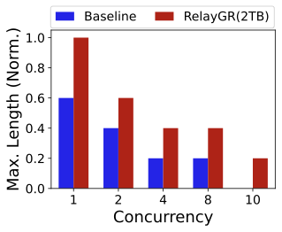 FigureĀ 13 shows that RelayGR increases the maximum sequence length that satisfies the P99 SLO compared to the baseline. Adding server-local DRAM reuse further extends the maximum supported length by avoiding repeated pre-inference across bursts of requests from the same users. In our setup, using all available DRAM ($`\sim`$500GB) yields a DRAM hit rate of about 10% and increases the maximum supported sequence length by up to 1.5$`\times`$ over the baseline. (We discuss higher hit rates enabled by additional tiers, e.g., SSD, as an extension point; the core results in this paper focus on HBM/DRAM, i.e., 2TB and 4TB yielding $`\sim`$50% and $`\sim`$100% hit rates, respectively.)