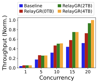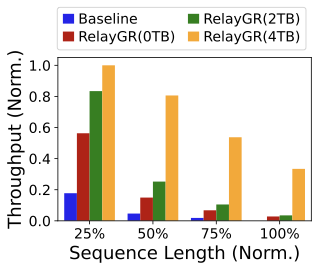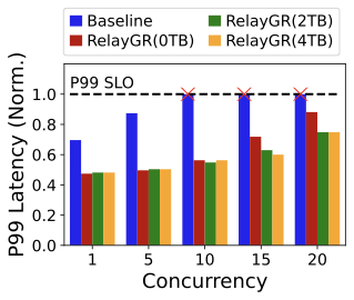 FigureĀ 17 shows that RelayGR improves throughput (QPS) under the P99 constraint. With DRAM reuse, more requests skip pre-inference and directly reuse cached $`\psi`$, yielding further gains. Using all available DRAM improves throughput by up to 3.6$`\times`$ over the baseline in our setup. These results indicate that relay-race inference is a practical path to making long-sequence GR cost-effective in production while maintaining strict P99 SLOs.