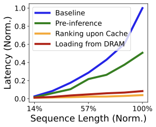 The long-term prefix is available at the beginning of retrieval and is largely decoupled from candidate filtering. This enables a ārace-aheadā execution: compute the prefix during retrieval, cache its intermediate states, and reuse them when ranking later scores candidate items (FigureĀ 6). If the expensive long-prefix computation is removed from the ranking critical path, ranking latency becomes much less sensitive to total sequence length; it primarily depends on the incremental tokens (short-term/cross features) and the item batch. We formalize this idea as