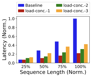 FigureĀ 21 shows that DRAM$`\rightarrow`$HBM loading latency increases with both sequence length and concurrency, but remains far below baseline full inference. This aligns with the cost model: attention computation grows super-linearly with sequence length, whereas cache loading scales approximately linearly with cache size (about tens of megabytes per user). Thus, for long sequences, using stored $`\psi`$ to avoid recomputation is increasingly advantageous, especially at moderate concurrency and under tight SLO constraint.