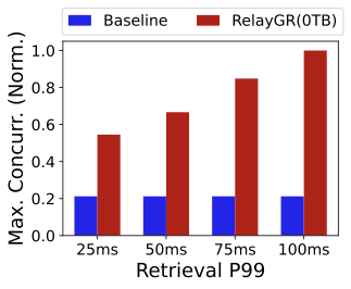 FigureĀ 23 studies how the retrieval-stage tail latency budget impacts the maximum supported concurrency. The baseline is unaffected because all computation happens in fine-grained ranking. In contrast, RelayGR can exploit additional retrieval slack to perform more relay-race pre-inference, increasing the number of simultaneously supported queries. When retrieval P99 is 100āms, the maximum supported concurrency is about 5$`\times`$ that of the baseline in our experiments (more pre-inference are triggered during the retrieval). This suggests RelayGR can trade retrieval slack for ranking tail-latency headroom in bursty scenarios.
