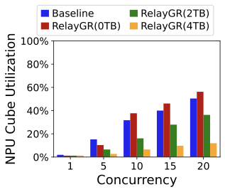 FigureĀ 25 reports NPU (cube) utilization under different concurrency levels. GR inference is compute-intensive; utilization increases with concurrency but also increases tail latency due to contention. RelayGR with 0% DRAM hit can increase utilization because it introduces additional pre-inference work; higher DRAM hit rates reduce this extra work and thus reduce utilization. Importantly, RelayGR allows this utilizationālatency trade-off to be tuned while keeping ranking-stage P99 intact.