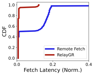 If prefix caches are placed in a distributed pool without affinity (i.e., without RelayGR), ranking may require remote cache fetches across servers. As shown in FigureĀ 18, remote fetch latency (blue line) can be hundreds of times higher than local-cache access (red line, RelayGR) and can easily exceed the request lifecycle window.. These results motivate RelayGRās key invariant: no remote fetch on the ranking critical path.