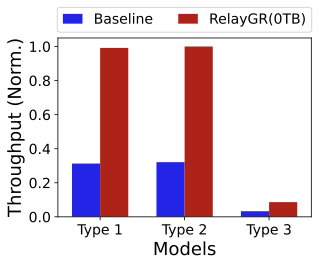 Finally, we evaluate RelayGR across multiple GR models (FigureĀ 29) and Ascend NPU types (e.g., Ascend 310 (TypeĀ 1) and 910C (TypeĀ 2), FigureĀ 30). Although the absolute latency and throughput vary substantially across modelsāsometimes by nearly an order of magnitude under default settingsāthe relative trends are consistent: RelayGR extends the maximum sequence length that can be served and increases SLO-compliant throughput under strict tail-latency constraints. Model sizes also differ markedly. The combined LongerĀ + RankMixerĀ model (TypeĀ 3) is significantly larger than HSTU (TypeĀ 1) and its variant (TypeĀ 2). Under default settings, TableĀ 1 reports a per-request KV cache footprint of 32,MB. Note that TypeĀ 2 differs from TypeĀ 1 only in its attention computation, while for TypeĀ 3 we cache only the Longer component; RankMixer is implemented as a downstream DLRM in the fine-grained ranking stage. Finally, even with a 2K-token input, the TypeĀ 1 baseline can exceed the P99 latency budget, making long-sequence GR infeasible without cachingāfurther highlighting the practical value of RelayGR.