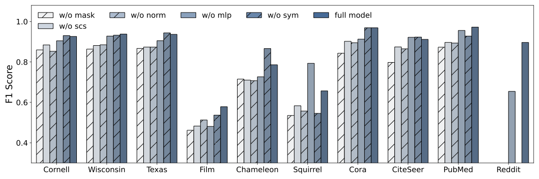 Adaptive masking. Replacing the adaptive masking with hard masking (w/o mask) results in the most significant performance drop across most datasets, confirming that isolating exact-$`k`$ neighborhoods while retaining triangle-rich edges is fundamental for model effectiveness.