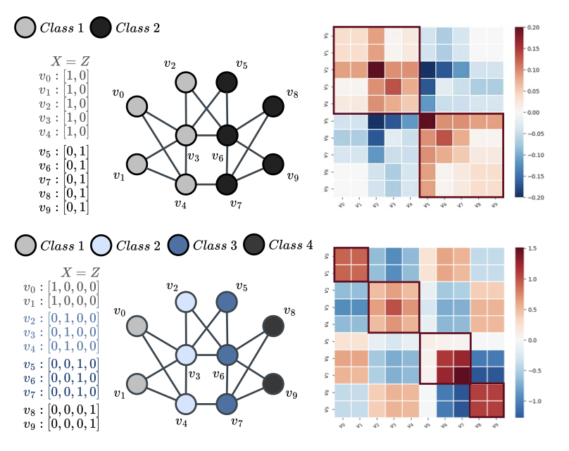 Binary case. When only two classes are present, intra-class node pairs (outlined blocks on the diagonal) exhibit strong positive similarity (red), while inter-class pairs are negative (blue). This means that Laplacian aggregation accurately separates nodes from the two given communities, assigning positive similarity only to nodes from the same class.