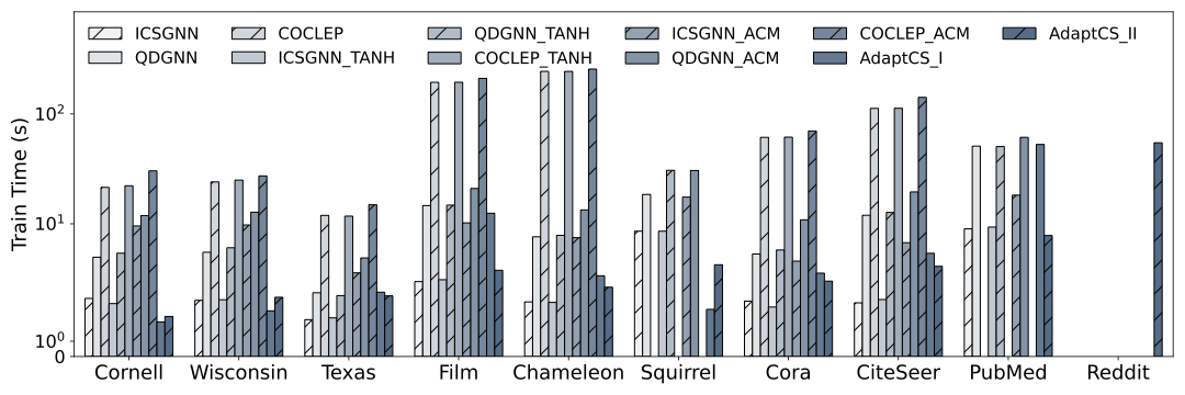 Training phase. SVD compression eliminates OOM and shortens runtime. AdaptCS-II is the only model that fits into a single GPU on the 110-million-edge Reddit graph, finishing the offline stage within 40s, whereas every other GNN variant crashes with OOM. AdaptCS-II achieves similar or better runtime compared to AdaptCS-I. Compared to baselines, both AdaptCS variants demonstrate better training efficiency, especially for the ACM-enhanced baselines, which pay an additional cost for channel mixing. The numbers in 6 report per-epoch training time and therefore exclude the one-off SVD pre-computation; the pre-computation takes 0.2s on Texas and up to 90s on Reddit. This cost can be ignored after being amortized over hundreds of training epochs.