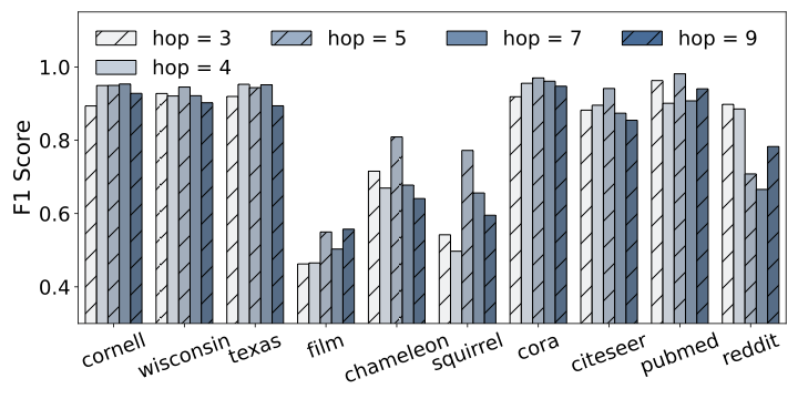Hop number $`\boldsymbol{k}`$ â 10. The hop count decides how many exact-hop channels are aggregated, balancing receptive fields against noise. We vary $`k`$ between 3 and 9. Performance improves until $`k`$ reaches 5, after which additional hops add marginal information and even lower scores on sparse graphs such as Chameleon. Because long-range signals introduce weakly related nodes, we fix $`k\!=\!5`$ in all experiments.