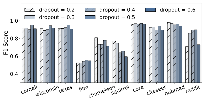 Hidden dimension $`\boldsymbol{h}`$ â 11. The hidden size determines the capacity of the projection MLP that follows channel mixing. Tested values range from 64 to 1024. F1 climbs steadily up to $`h\!=\!512`$; larger widths contribute may over-fit small graphs, while increasing training time. Hence, we adopt $`h\!=\!512`$ as a balanced setting in the experiments.
