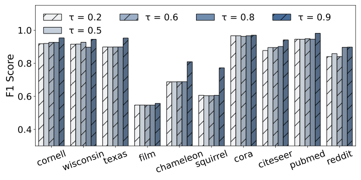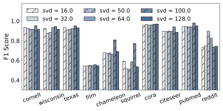SVD rank $`\boldsymbol{r}`$ â 9. The SVD rank $`r`$ determines the number of leading spectral components used in the low-rank approximation. Across most datasets, F1-score remains largely stable as $`r`$ increases from 16 up to 128, indicating that the low-rank operator is robust and most structural information is preserved even at low rank. Notably, a clear improvement is observed at $`r = 100`$, where performance peaks or reaches its best on several datasets. Based on this observation, we set $`r = 100`$ as the default, with $`r = 128`$ used only for the largest graph (Reddit) to ensure maximum coverage.