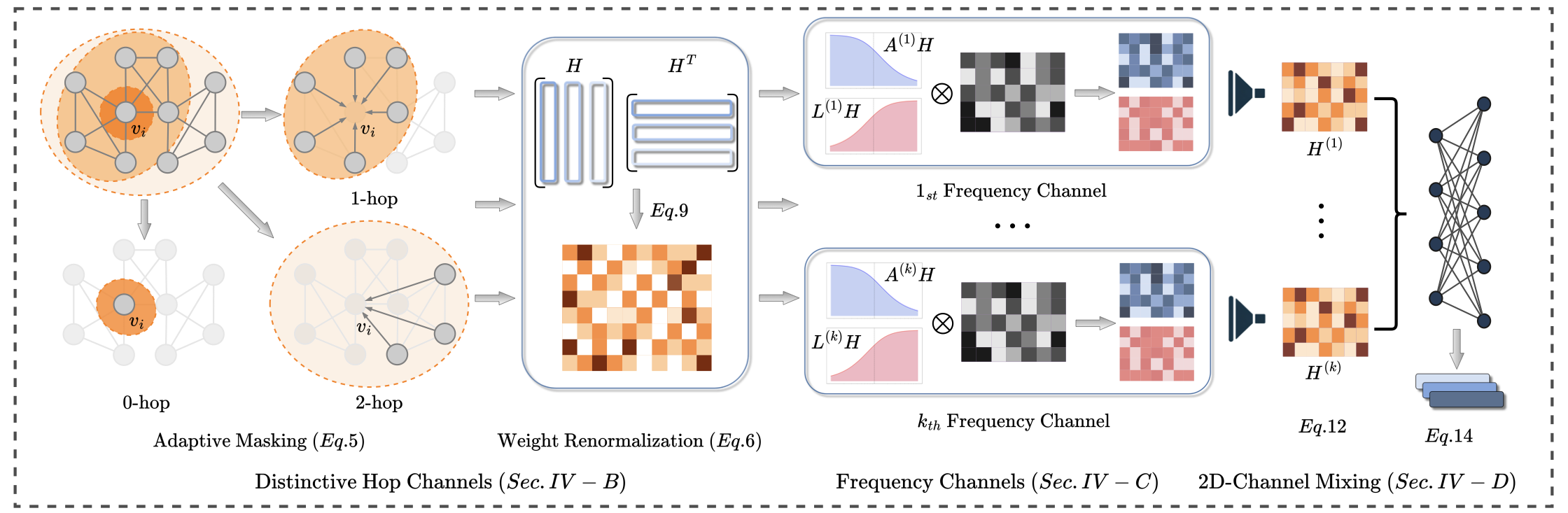 Stage 1: Distinctive-hop channel (Sec.4.2). Given a node $`v_i`$, we recursively conduct $`k`$-hop neighborhoods aggregation to construct distance-aware features. The $`k`$-th channel only aggregates information from neighbors with an exact shortest distance of $`k`$, which eliminates redundancy and noisy messages during convolution. We then apply the weight-renormalization operator to amplify signals to maintain numerical stability.