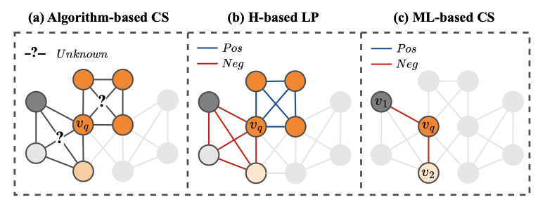 (b) Compatibility-matrix based label propagation ($`H`$-based). This line of methods , tackles heterophily in node classification by introducing a pre-defined or statistically learned compatibility matrix that governs how labels interact across edges. The inferred matrix enables cross-class propagation beyond the homophily assumption and can be naturally extended to community search by expanding from a query node to others predicted to share the same community. However, the compatibility matrix $`H`$ is either predefined or globally optimized, remaining fixed across the graph and unable to adapt to local variations in heterophily. As illustrated in 1(b), the query node $`v_q`$ simultaneously connects to two distinct neighborhoods, where one is dominated by positive links and the other by negative links, exhibiting contrasting local homophily levels that a single global $`H`$ cannot accurately capture. Consequently, such models often mispropagate signals across incompatible regions and fail to retrieve communities with heterophilic edge semantics.
