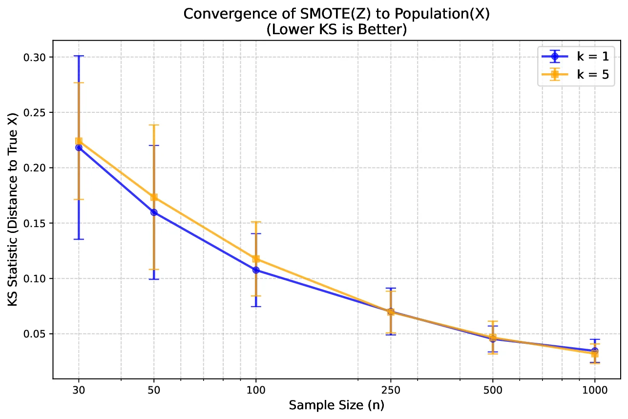 To validate Theorem 1 on real-world data, we analyzed carbon monoxide readings from the UCI Air Quality dataset , treating the full series as the ground truth $`X`$. We generated synthetic samples $`Z`$ from subsets of varying sizes $`n`$ using neighbor ranks $`k=1`$ and $`k=5`$, measuring the Kolmogorov-Smirnov (KS) distance to $`X`$. As shown in Figure 1, the error decreases monotonically as $`n`$ increases, confirming convergence in probability. Moreover, $`k=1`$ yields consistently lower KS statistics than $`k=5`$ at smaller sample sizes, empirically supporting our theoretical conclusion that lower neighbor ranks lead to faster convergence.