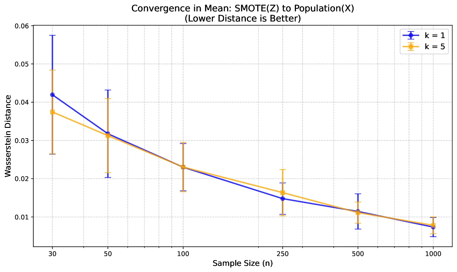 Our results have practical implications for the application of SMOTE in data augmentation. They suggest that using the nearest neighbor ($`k = 1`$) in the SMOTE algorithm is preferable for achieving faster convergence to the original distribution. This insight can guide practitioners in selecting appropriate parameters for SMOTE and potentially improve the performance of models trained on augmented data.
