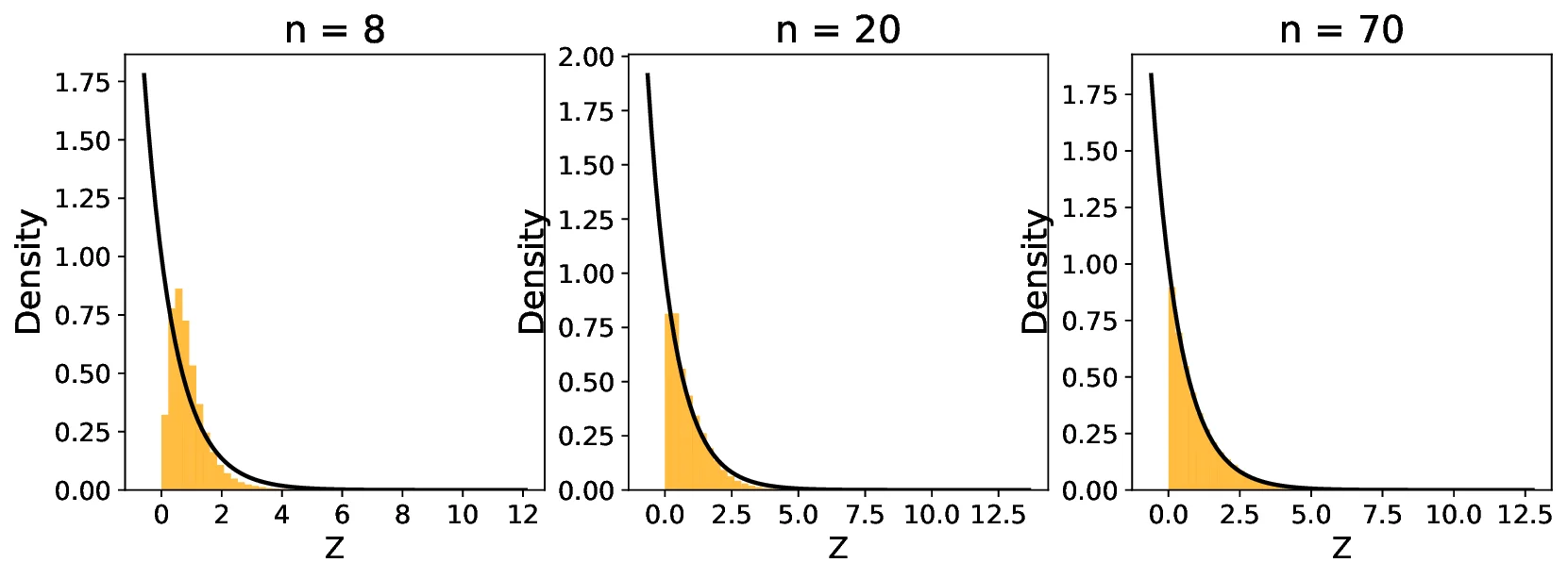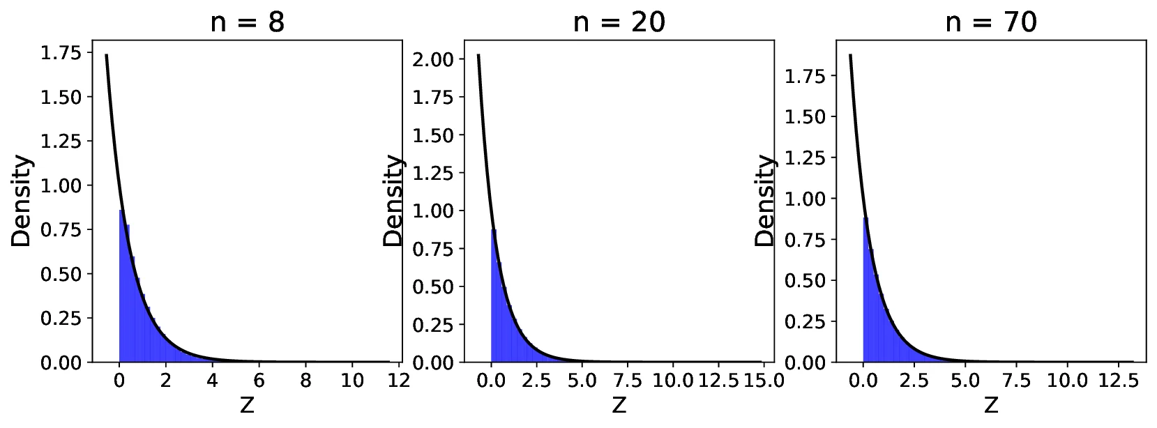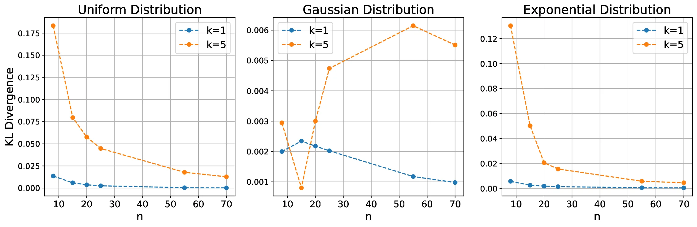 Empirical Validation: We support our theoretical findings with simulation studies using uniform, Gaussian, and exponential distributions. The simulations illustrate the convergence behavior of $`Z`$ for different values of $`k`$ and sample sizes $`n`$ (Figures 5–8). We observe that lower values of $`k`$ result in faster convergence of $`Z`$ to the distribution of $`X`$, as measured by the Kullback-Leibler (KL) divergence (Figure 12).