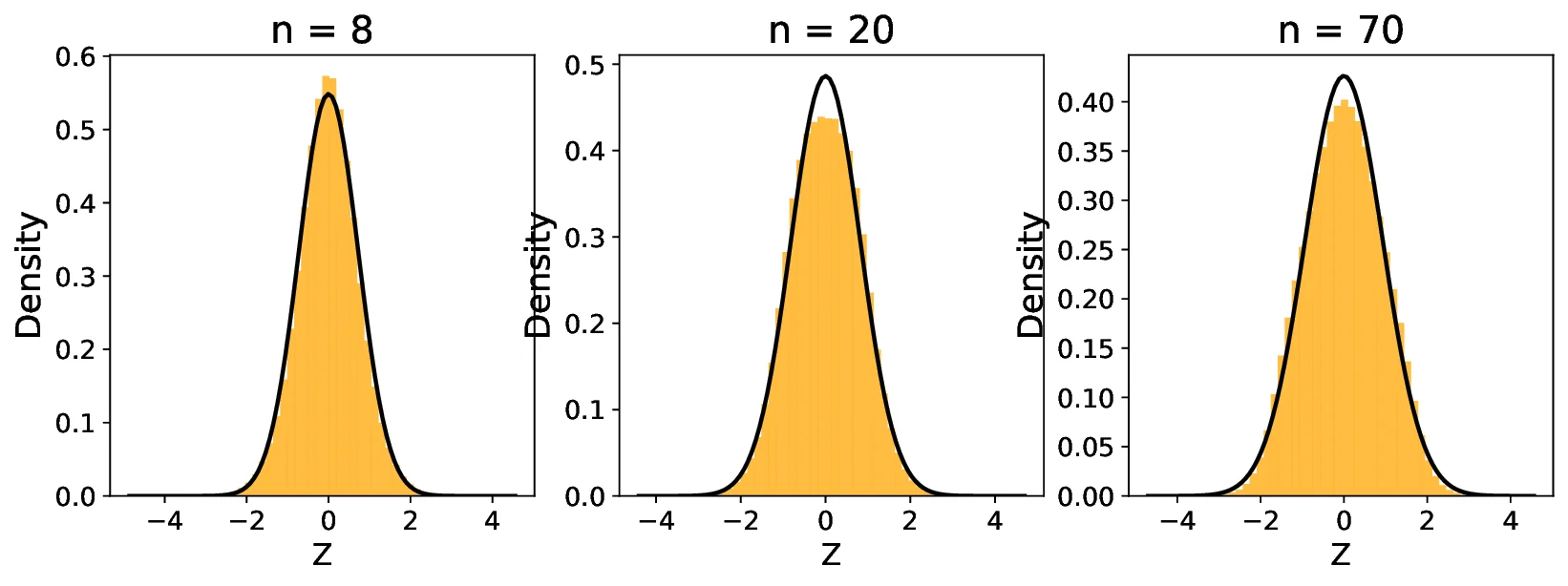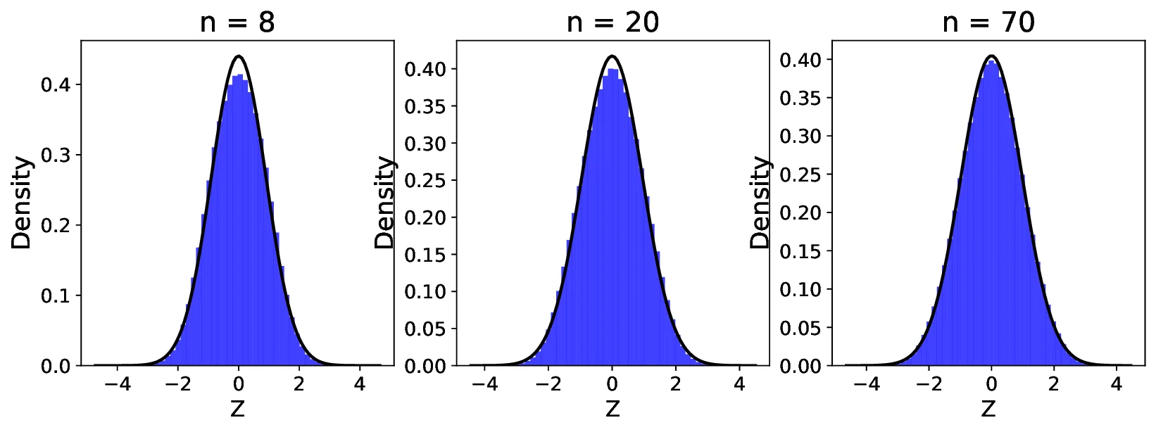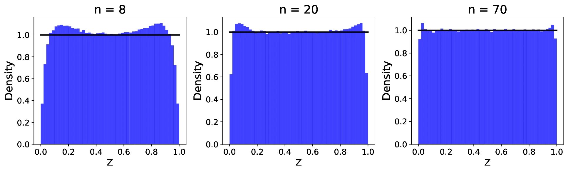 Figure 5 displays the distribution of $`Z`$ simulated for sample sizes $`n = 8, 20, 70`$ based on the uniform random variable $`X \sim U(0,1)`$. In Figure 3, we used the nearest neighbor of rank $`k=1`$, whereas in Figure 4, we used $`k=5`$. As shown in the figures, for both $`k=1`$ and $`k=5`$, the distribution of $`Z`$ converges to that of $`X`$ as $`n`$ increases. However, the convergence is significantly faster in the case of $`k=1`$ compared to $`k=5`$, especially for lower values of $`n`$.