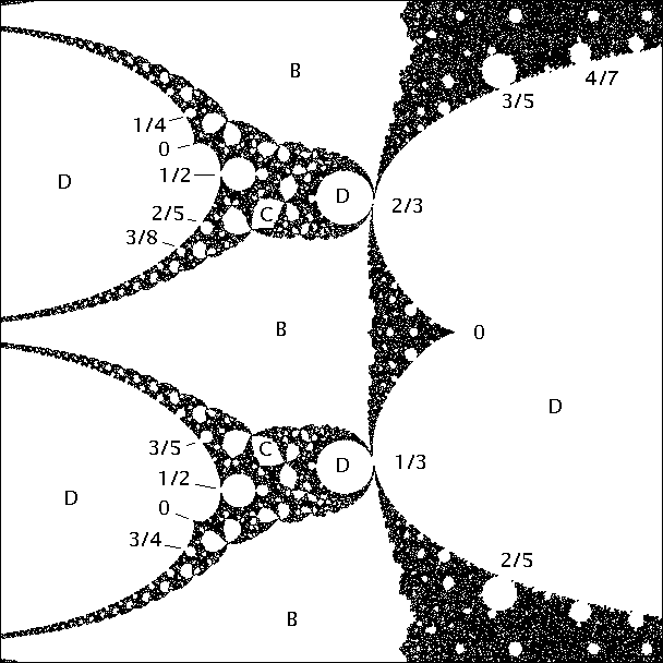 Figure 13.a3-plane for the family of maps z 7→a + 1/z2 , with one critical pointmapping directly to the other. In the more conspicuous hyperbolic components (typeB or E), the period of the attractor is indicated.Maps for which one critical point maps eventually to the other.