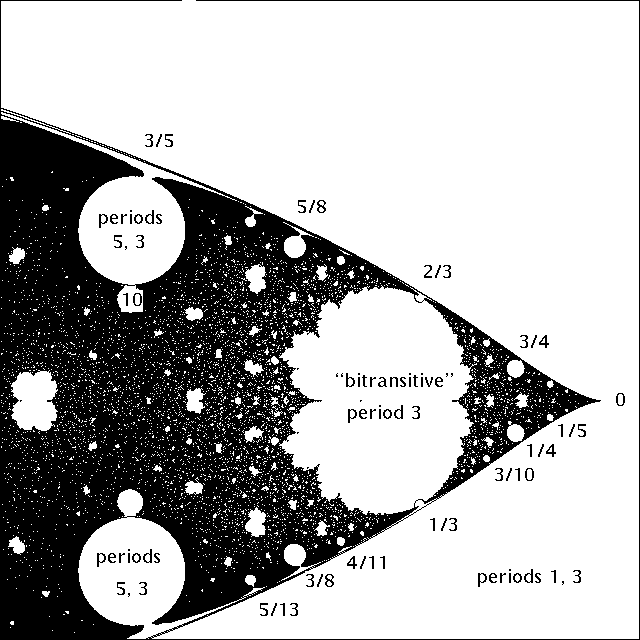 (Horizontal scale exaggerated.) The periods of (possiblycomplex) attracting orbits for some of the more prominent hyperbolic componentsare indicated.