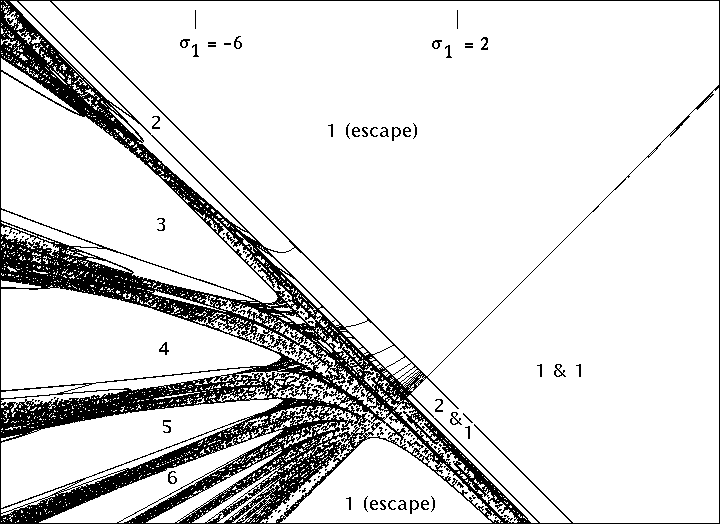 Figure 16. Picture of the rectangle [−12, 10]×[−10, 22] in the real (σ1 , σ2)-plane, em-phasizing dynamic behavior.