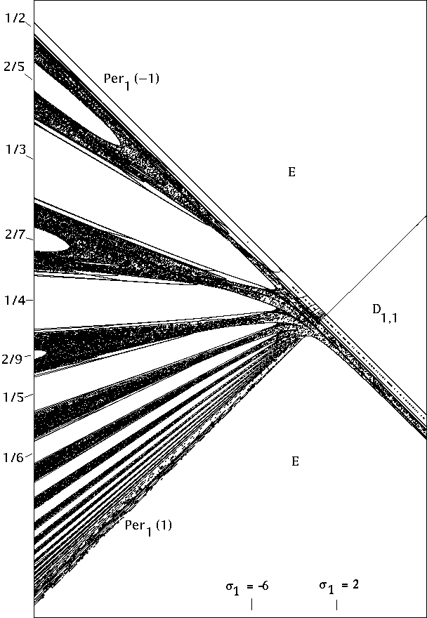 For σ1 very negative, with σ2/σ1 ≈2 cos(2πip/q)we are in a component of type B with attracting orbit of period q . Some representative values of p/q areindicated along the left margin.